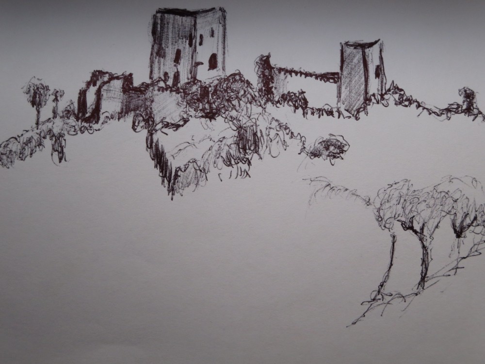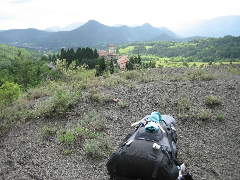 Woensdag, 26.6, Puivert. Rustige nacht gehad. Gisteren bij het inslapen voelden mijn voeten nog zwaar en vermoeid. Ik heb veel van ze geëist die eerste dag. Ik besluit nog een dag te blijven en de hele tocht te herzien. Zo’n lange stapdagen langs dorpjes waar geen eten te scoren valt zijn niet haalbaar. Tenminste, ik zie het niet zitten. Van Puivert naar Montségur zijn drie stapdagen zonder winkels en rantsoen voor drie dagen erbij maakt de rugzak helemaal te zwaar. Ik maak het mezelf gemakkelijk en zal liften naar Lavelanet. Via een andere wandelroute en een stuk GR7 raak ik op één dag – zo hoop ik – in Montségur. Op de kaart lijkt het haalbaar. Vandaag laat ik die zorgen voor morgen los. Ik lig bij het meertje te lezen, mensen kijken, schrijven, tekenen. Beetje niksen. En geniet van de ontspanning. Vanavond ga ik buurten bij de Nederlanders uit Nijmegen die ik gisteren heb ontmoet. Ik haal een wijntje bij de kruidenier en we heffen samen het glas.