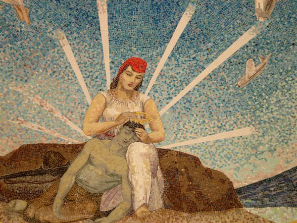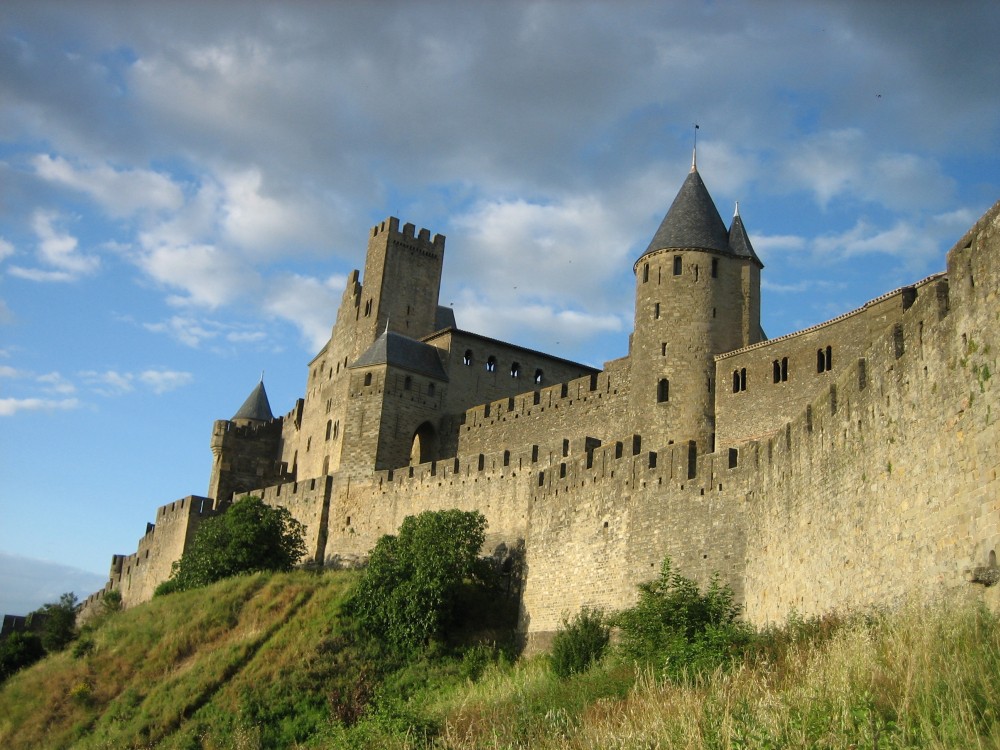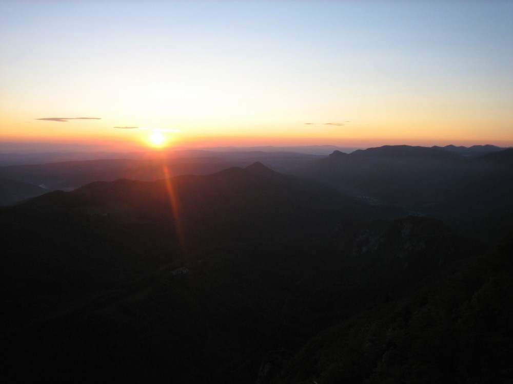 Maandag, 1.7. Montségur. Ik sta op om 4.30 uur en ga in het donker met een hoofdlampje het pad op. Om 5.45 uur bereik ik de top van de berg, vind al gauw een plekje naar het oosten en ga zitten naast de burcht. Ik kom voor het stille spektakel van de zonsopgang. Een roze-paarse gloed over de bergen. Niets dan zacht gestjirp van vogels in de bomen. Het zachte gerinkel van de koeienbellen helemaal aan de overkant van de vallei. Roze wordt oranje. Wolkenflarden lichten op in felle kleuren. En daar is ze. Een vuurrode bal verschijnt langzaam aan de horizon. En boven de ruïne nog een sikkel maan. Dit is wondermooi. Om stil van te worden. Een prachtig afscheid van een prachtige herinnering. Montségur, het gevoel van vrienden voor het leven. Brood en wijn delen met de toevallige passant. Ik keer terug naar het dorp met een glimlach in het hart. De ‘mur de clochet’ doet haar werk om 7 uur. Langzaam breek ik mijn kampje op. Alles weer netjes op zijn plaats in de rugzak. Ik krijg een lift naar Mirepoix. De markt, het geroezemoes van de terrasjes. Lekker eten. De messenslijper ontfermt zich over mijn mes. Ik vind een leren riempje voor het juweel – een Katharenkruis, mijn aandenken aan deze streek. Om nooit te vergeten van de inquisitie, de brandstapels, de littekens van le Pays Cathare.