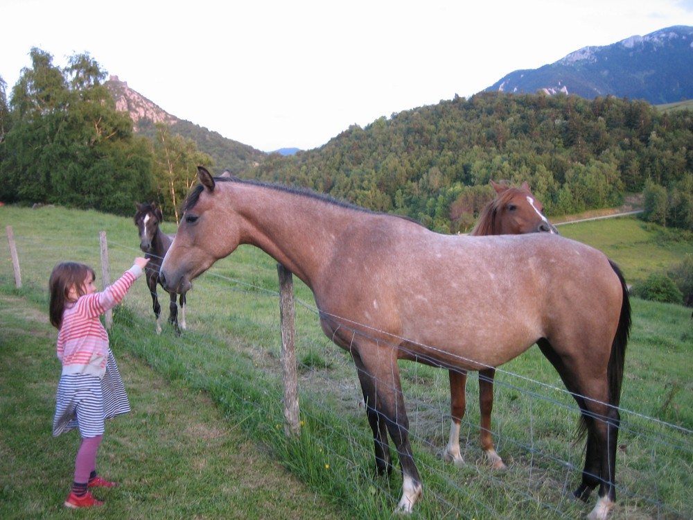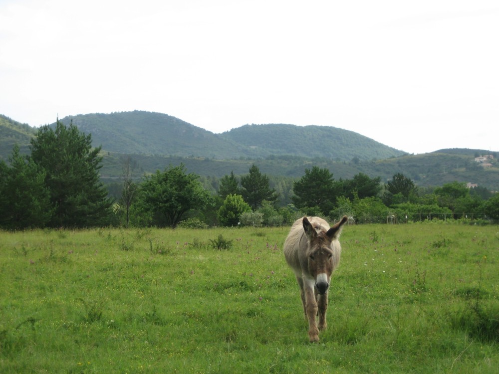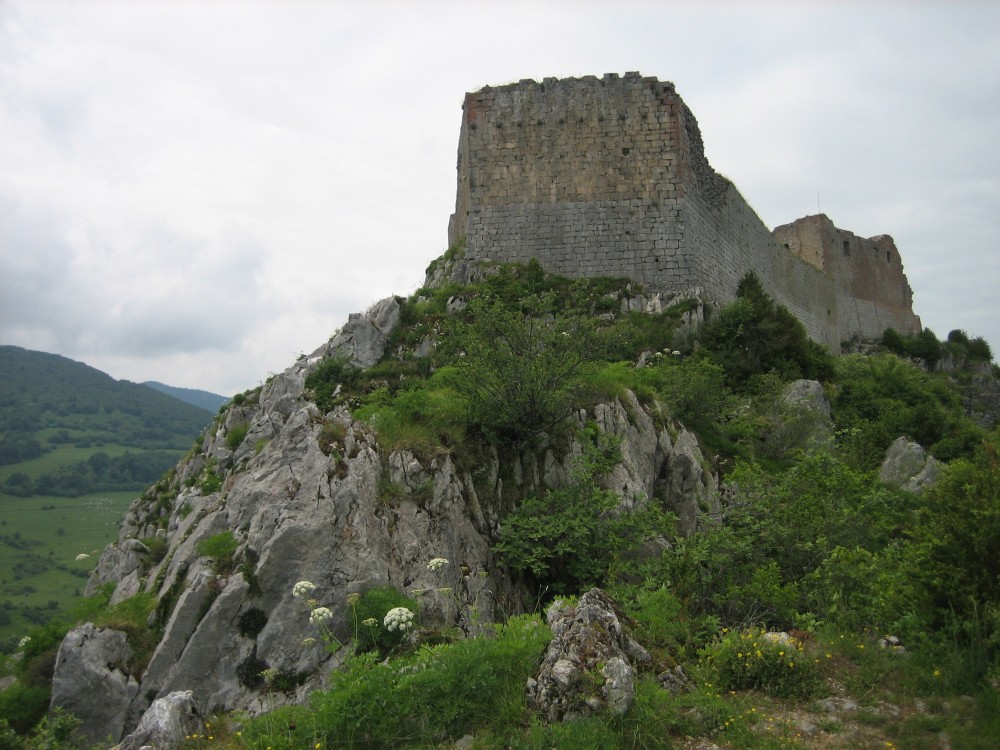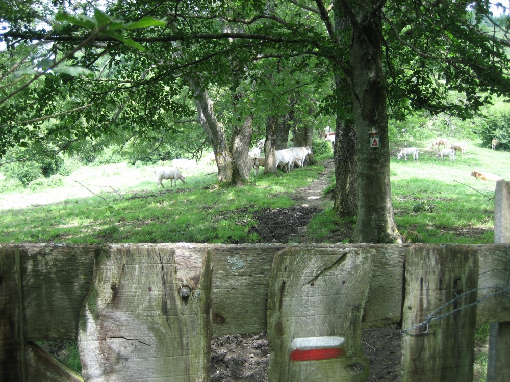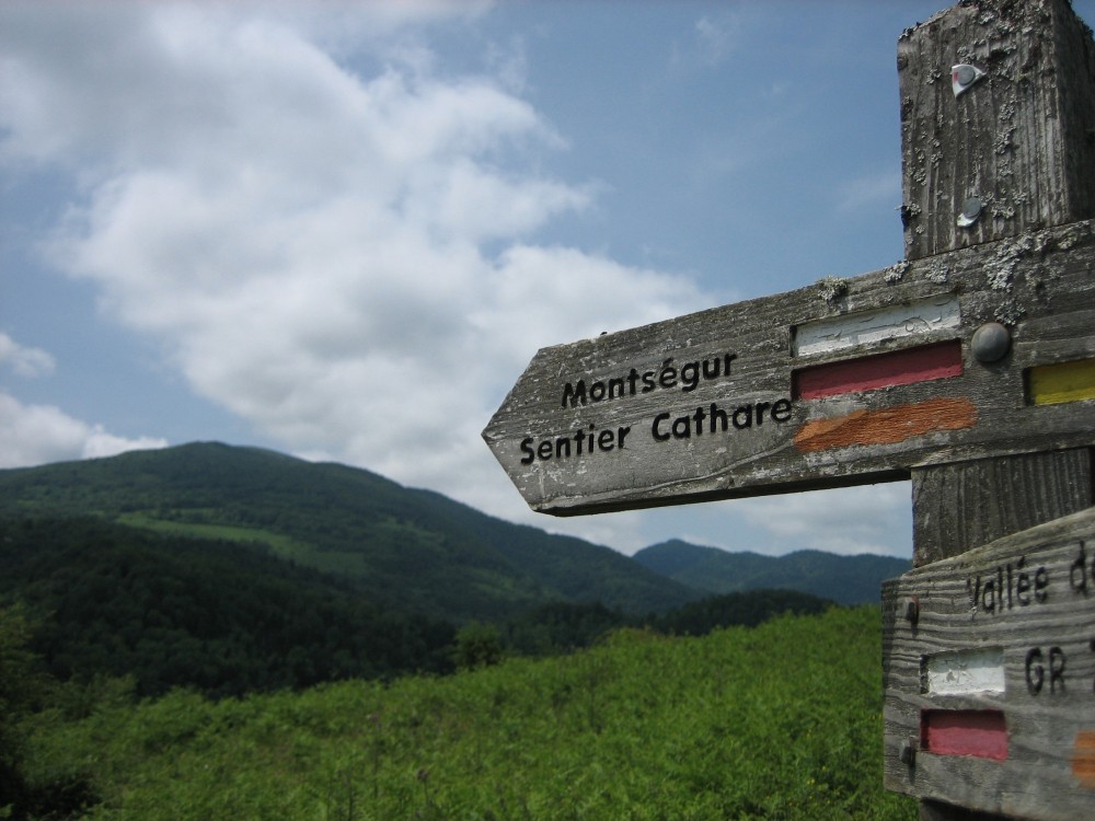 Donderdag, 27.6, Puivert-Montségur. Ik lift tot Belista, haal nog meer pleisters bij de apotheek en lift verder tot Lavelanet. Na vier uur stappen bereik ik Montségur, het doel van de reis. Bij de kruising van de GR7 en GR7bis op het plateau zie ik de steile ‘poch’ met de burcht in al haar glorie. Wow. Kicken! Niet te zwaar, hoewel de blaren steeds venijniger van zich laten horen. De huid rond mijn linkerhiel is weg. Mijn linkerschoen is net iets te groot. Maar wat een mooie etappe. Ik heb er zin in. Het is even spannend wanneer ik door een kudde koeien moet. Ze staan alle 20, met wat kalfjes erbij, midden op het pad. Rechts en links een hoop modder, plassen en koeievlaaien. Dat is geen optie. Zij moeten wijken. Stap voor stap nader ik de dieren. Ik zeg “chouchou!”, “laissez passer” en nog wat koeietaal. “I come in peace”. Ze zijn evengoed op hun hoede als ik. Maar ze wijken en geven mij het pad.
