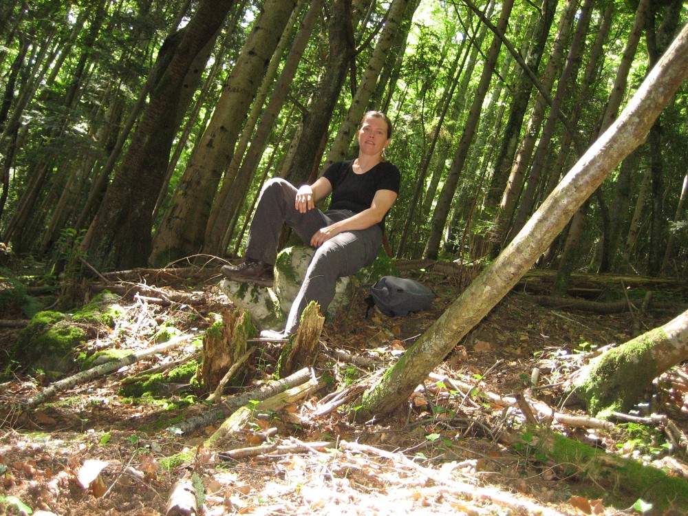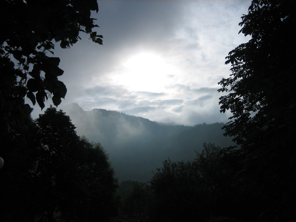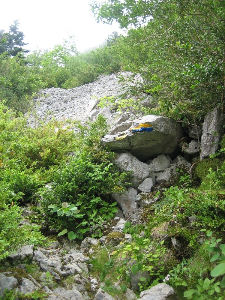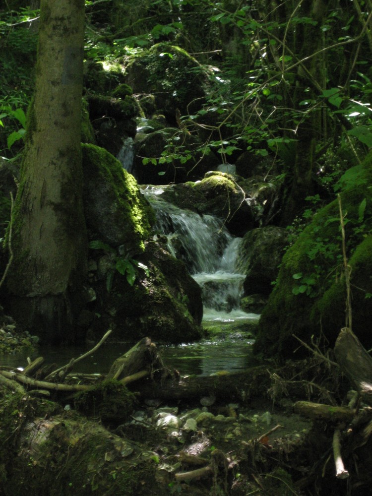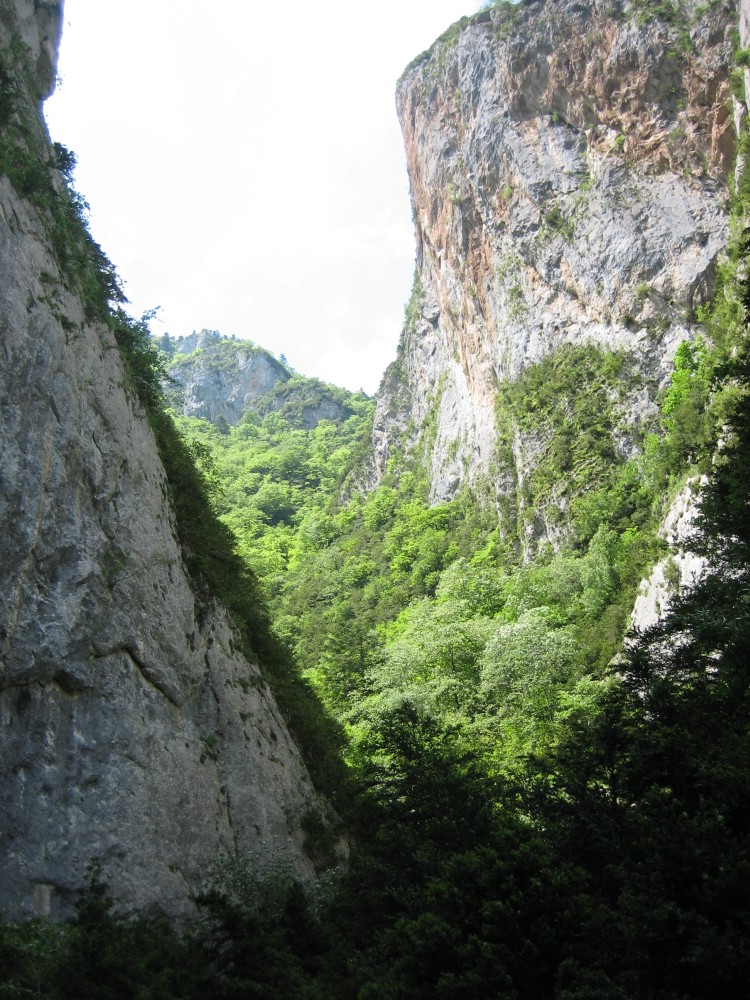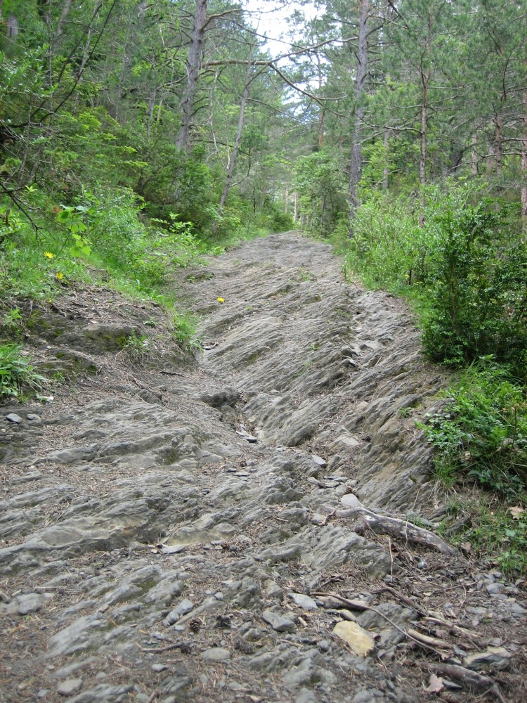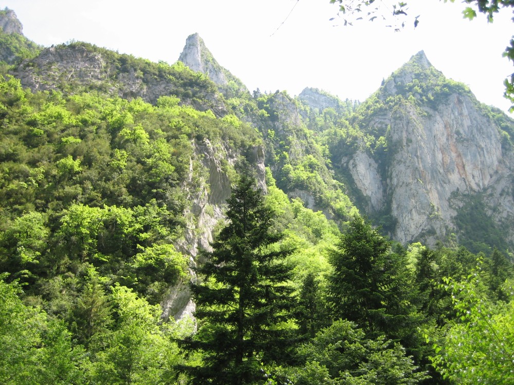 Zaterdag, 29.6. Montségur-Gorges de la Frau. De bergen rond het dorp zijn verhuld in dikke, opstijgende mistige wolken. De geplande tocht naar een hoger gelegen grot gaat niet door. Je ziet er geen steek voor ogen door de mist. Ik besluit er alleen op uit te trekken naar de Gorges de la Frau. Het gaat eerst nog makkelijk, lichtjes stijgend door het bos. Dan moet ik zo’n 200 meter over een muur van rotsen. Ik moet goed grijpen en twee keer voelen voor ik mijn voeten neerzet. De kleine stenen liggen los en het is hier erg steil. Dit was een stuk etappe wat ik – volgens de planning thuis – met de rugzak zou gedaan hebben. Ik dacht het niet. Mijn hoogtevrees belt aan. Ik doe niet open. Met een bang hartje, slappe knietjes en een adrenalistoot doorkruis ik dit moeilijke stuk. Daarna gaat het bergaf door het bos. Het pad is één grote modderpoel door de vele kuddes en mountain bikes die hier passeerden. De lenteregens zijn nog maar net gestopt en de zon bereikt dit dichtbeboste pad niet. De plassen en de modder blijven nog wel even het wandelen moeilijk maken. Ik ga de gorges in tot voorbij de Pas de l’Ours, volg nog enkele bochten en besluit dan terug te keren. Ik wil liften naar het dorp en als ik te lang wacht is hier geen wandelaar meer te bespeuren. Ik heb geluk. Bij de parking stappen net twee wandelaars hun auto in. Ze moeten langs Montségur. Ik heb vijf uur gestapt en ben erg blij dat ik de rugzak niet moest dragen.
