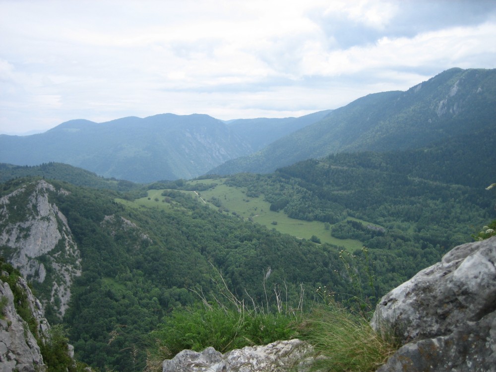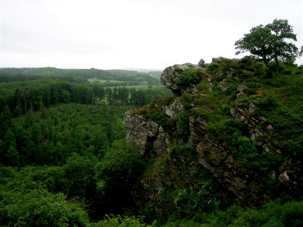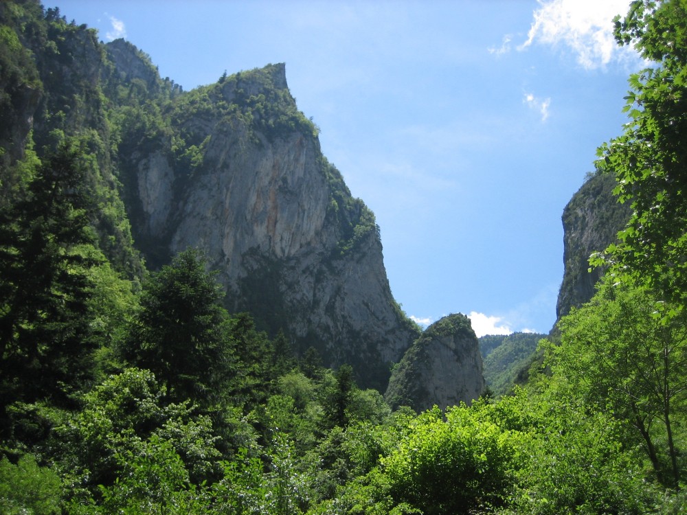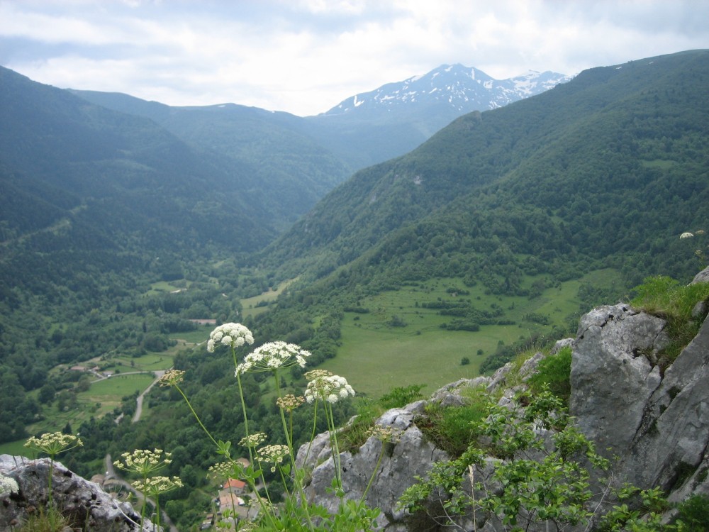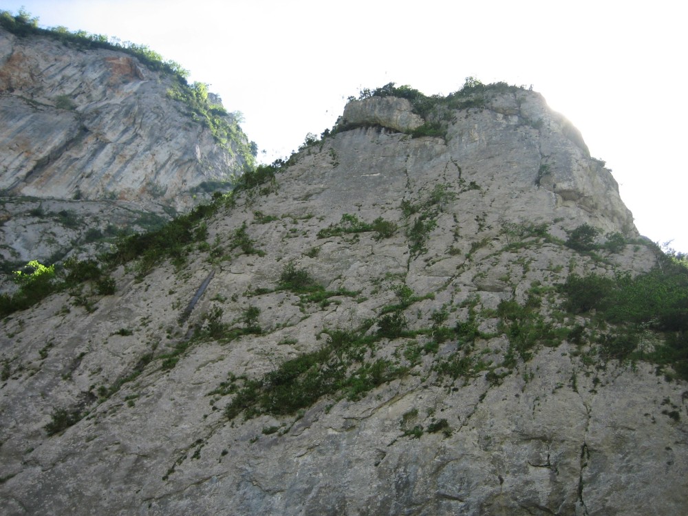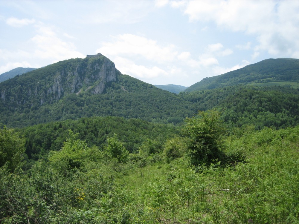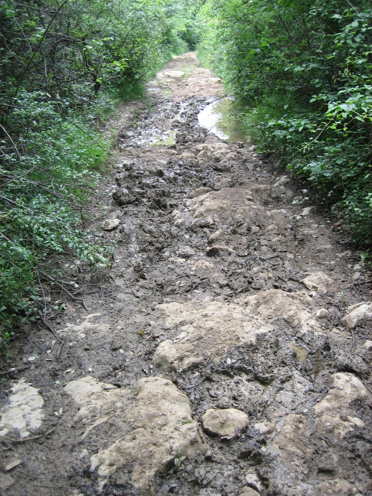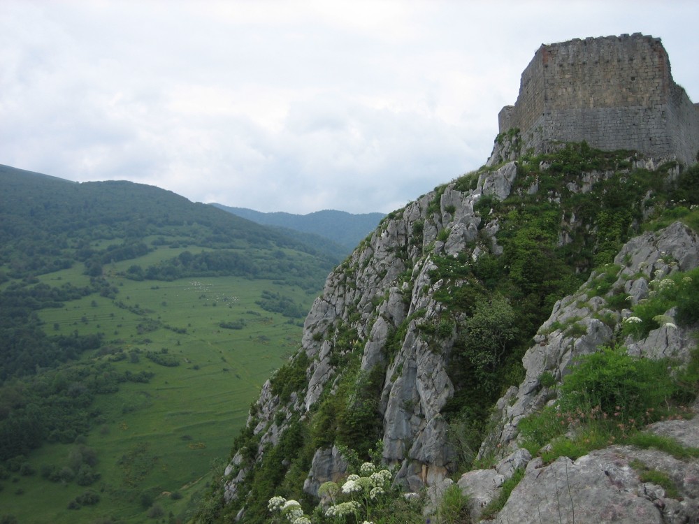 Zaterdag, 29.6. Montségur-Gorges de la Frau. De bergen rond het dorp zijn verhuld in dikke, opstijgende mistige wolken. De geplande tocht naar een hoger gelegen grot gaat niet door. Je ziet er geen steek voor ogen door de mist. Ik besluit er alleen op uit te trekken naar de Gorges de la Frau. Het gaat eerst nog makkelijk, lichtjes stijgend door het bos. Dan moet ik zo’n 200 meter over een muur van rotsen. Ik moet goed grijpen en twee keer voelen voor ik mijn voeten neerzet. De kleine stenen liggen los en het is hier erg steil. Dit was een stuk etappe wat ik – volgens de planning thuis – met de rugzak zou gedaan hebben. Ik dacht het niet. Mijn hoogtevrees belt aan. Ik doe niet open. Met een bang hartje, slappe knietjes en een adrenalistoot doorkruis ik dit moeilijke stuk. Daarna gaat het bergaf door het bos. Het pad is één grote modderpoel door de vele kuddes en mountain bikes die hier passeerden. De lenteregens zijn nog maar net gestopt en de zon bereikt dit dichtbeboste pad niet. De plassen en de modder blijven nog wel even het wandelen moeilijk maken. Ik ga de gorges in tot voorbij de Pas de l’Ours, volg nog enkele bochten en besluit dan terug te keren. Ik wil liften naar het dorp en als ik te lang wacht is hier geen wandelaar meer te bespeuren. Ik heb geluk. Bij de parking stappen net twee wandelaars hun auto in. Ze moeten langs Montségur. Ik heb vijf uur gestapt en ben erg blij dat ik de rugzak niet moest dragen.