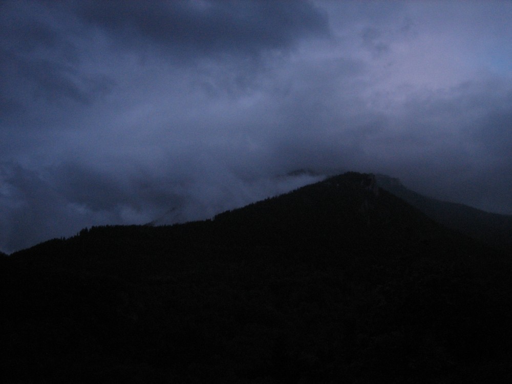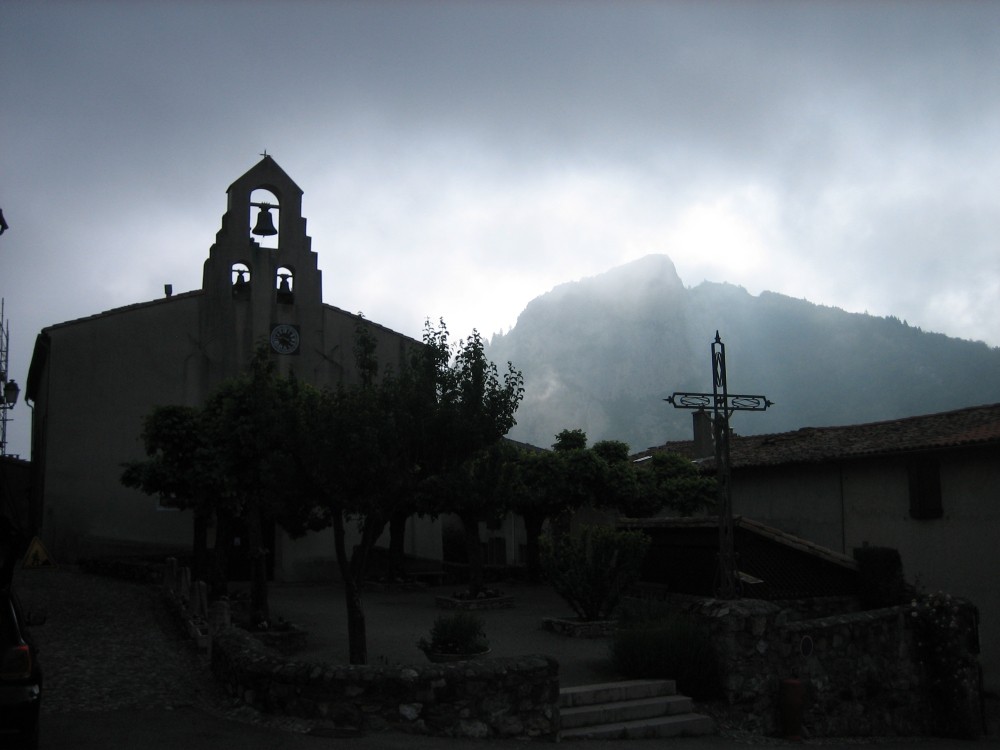 Vrijdag, 28.6, Montségur. Ik word wakker door het rumoer van de soldaten. 7 uur. Te vroeg, terug naar bed. In de namiddag beklim ik de berg naar de ruïne. Het is een prachtig uitzicht. ‘s Avonds gaat het regenen. Eerst zachtjes, dan hardnekkig. Er is niemand meer te bespeuren in het dorp. Iedereen binnen. Bij het huis van Alain, een andere Alain – zijn het hier allemaal Alains? – is er teken van leven. Ik wordt uitgenodigd voor de aperitief en later eten we samen in de auberge de beroemde cassoulet. Alain toont het de ‘point de vue’ aan het einde van het dorp. Mooie plek. Er hangen mysterieuze wolken tussen de bergen.
