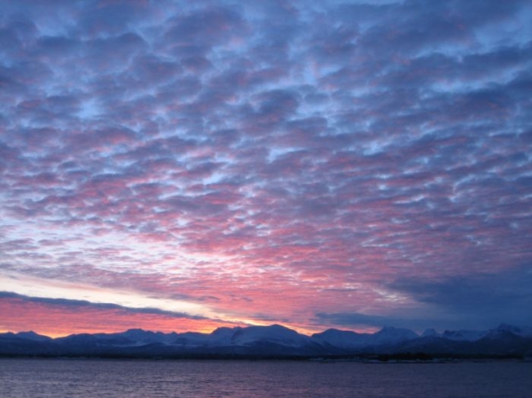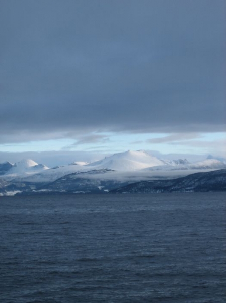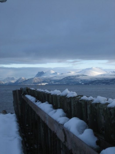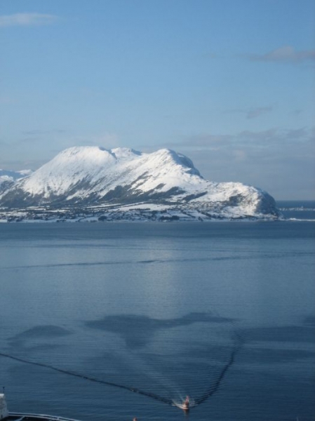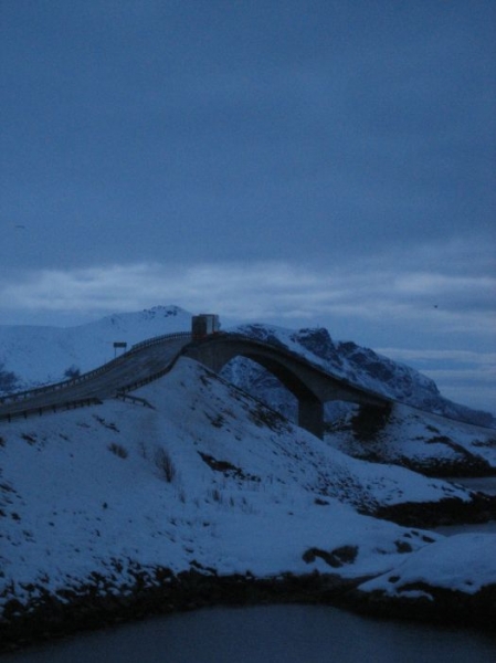 Sierlijke krommingen, ovalen ramen, ornamenten met bloemen en dieren getuigen doorheen heel het stadje Ålesund van de Jugendstil die hier neerdaalde na een alles verwoestende brand in 1904. In enkele jaren tijd werd de hele stad herbouwd in deze typerende stijl. Ook hier kan je na een kleine klimpartijover gladde sneeuwtrappen genieten van een panoramisch zicht over de baai. Ook hier weten de daken en straten zich bedekt door een dik sneeuwtapijt. Wit is de rode lijn door dit februarilandschap. Tot hier hadden we het reisplan concreet gemaakt: de vliegtickets, treintickets en de kajuitreservatie. Ondertussen – lang leve het internet – hadden we wel contact gehad met Thor in Molde. Hij had begrepen dat we Midøya wilden bereiken en kon ons er naartoe brengen met de auto. We nemen in Ålesund de ochtendbus naar Molde. Het verbaast ons dat gewone auto’s deze wegen kunnen trotseren. Misschien wordt er wel sneeuw geruimd, maar met de aanhoudende nachtelijke sneeuwval is het vechten tegen de bierkaai. Wanneer we de volgende dag aan de autotochtbeginnen wordt een en ander duidelijk. De autobanden hebben spijkers en de auto heeft een een antislipsysteem. Gooi daar nog een flinke portie Noors lef bovenop en dan rijd je aan tachtig per uur over spierwitte wegen. “No problem,” knikt Thor vanuit zijn schaatsende Mondeo. De bruggen van de Altantic Ocean Road doemen op als schanspistes en lijken de weg op te lossen in het duistere niets.