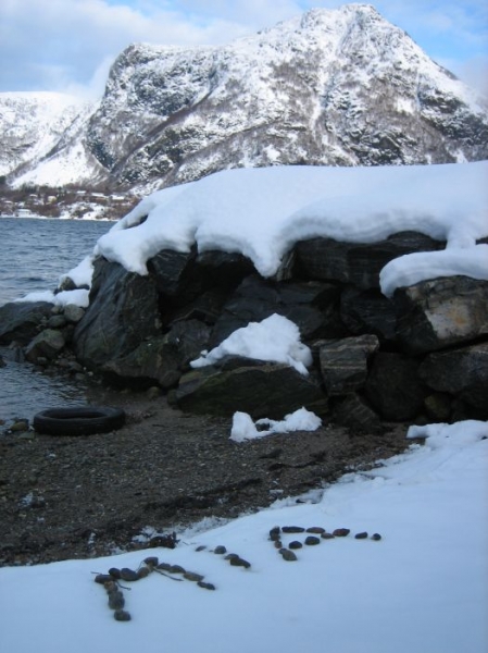 We zijn nu heel dicht bij het doel van de reis, het ritueel aan het strand. Mondjesmaat zoeken we toenadering tot een herinnering aan mama. We vertellen onze gastheer over de de letter M in de reusachtige atlas, over het kruikje met de as in onze bagage, maar ook over de strijdbijl die we moesten begraven. Het bier en de aquavit loopt vlotjes binnen en woorden vloeien mee met de stroom. Niets belandt nog tegen een koude muur. Het is allemaal warm en spontaan tot diep in de nacht aan een ronde tafel. Een dag later, twee veerboten en een brug verder, staan we op haar eiland. Een prachtige berg met een tepeltje rots er bovenop domineert de kleine landmassa. Elke nieuwe baai brengt een nog mooier vergezicht. Onderweg, naast herberg Thuishaven de Hoop, trekt een klein strandje onze aandacht. Zonder woorden, zonder aarzeling, alsof dit altijd zo bedoeld was, beginnen grote broer en ik stenen te rapen. In de witte sneeuw schrijven we met zwarte stenen een naam. Drie letters met een mooie punt op de i. Zo was ze wel. Vier handen van hetzelfde bloed schudden zachtjes de kruik leeg. De as vindt een weg in het deinende Noorse water. Hier mag ze rusten. Een vredespijp proefde nooit zo lekker.