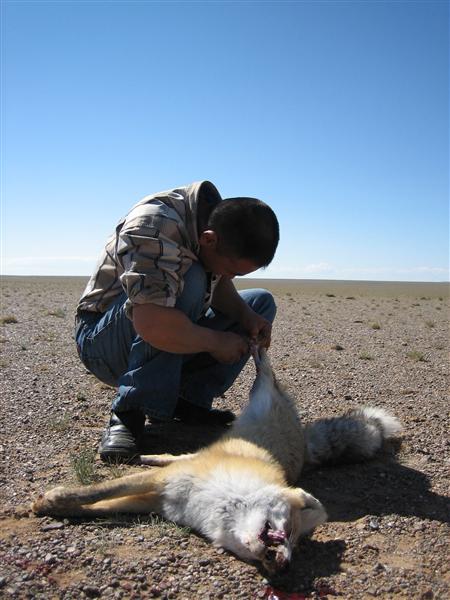 Voor ik goed en wel kan bekomen van een lichte walging, is de jacht opnieuw geopend. De vos waagt nog een tevergeefse poging tot ontsnapping. Even later heeft hij echter de longen uit het lede lijf gelopen en zijgt hij neer op deze immense vlakte. Agi stapt uit en klaart de klus met een klap van een sleutel. Ik weet niet waar ik het heb. De arenden en gieren daarentegen hebben al lang een oogje in het zeil en cirkelen rond boven het buffet. Agi begint vakkundig het kaf van het koren te scheiden. Zijn zoon maakt hoeden van pels. Die gaan allicht westwaarts in de bagage van een trotse toerist. Ik weet niet goed wat ik hiermee moet. Maar wat loop ik eigenlijk te mekkeren als een Gaia-geit? Ik vind die hoeden eigenlijk ook wel mooi, de gieren hebben ontbijt op bed, een Gobi muizenfamilie ziet zijn levensduur met tenminste een dag verlengd en Agi’s familie kan een dikke duit verdienen aan de hoed. Wat loop ik dan te contempleren op amateuristisch Boeddhistische wijze over het einde van alle lijden voor alle voelende wezens? Deze triomf van de sterkste, de survival of the fittest, vraagt toch om een vreugdedans, niet? Een foxtrot misschien…