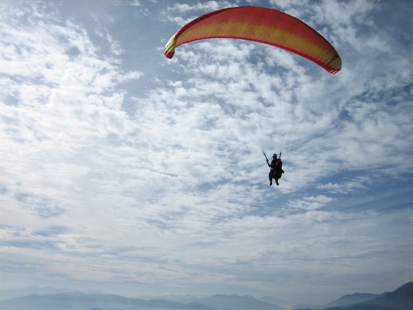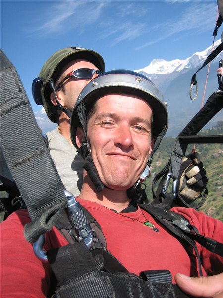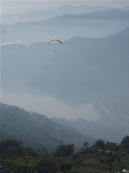 Dag vier ga ik een kijkje nemen. Ik hoor al dagen verslagen over inversie, 360, 180, S-bochten en thermiek. Wilde verhalen over concentratie en avontuur. Ik ga dus maar eens een kijkje nemen. De jeep wringt zich in alle bochten naar de bergtop bij Sarangkot. En daar staat ie dan, mijn piloot in spe, mijn superheld, Captain Courageous, boven op de berg omgeven door 8000ers, ver onder ons Phewa Tal. Hij rent vooruit met in zijn kielzog een web van draden en een zeil van hoop. Enkele tellen later is hij één met de lucht en de roofvogels. Wat begon als een verkenningstocht, een proeverij, is ontaard in een streven naar meer: HET attest, vrijgeleide voor verdere vliegpret. Ik blijf op de berg en aanschouw het wonder der aërodynamica, de overwinning op de zwaartekracht. Kees zweeft, Kees glijdt, maakt rondjes, S-bochtjes en landt bijna perfect – één schoen in het natte rijstveld.